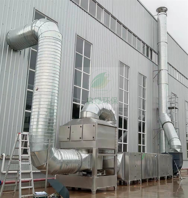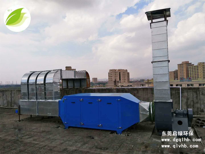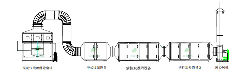 气源→高效气旋除尘塔(吸收掉漆雾、粉尘以及颗粒物)→干式过滤(再过滤)→活性炭吸附塔(吸附部分苯甲苯二甲苯)→高压风机(高压的吸力作用下持续将废气抽出车间)→烟囱高空排放(也可低空排放)。 该法净化效率可达90%以上,大大改善了大气环境。