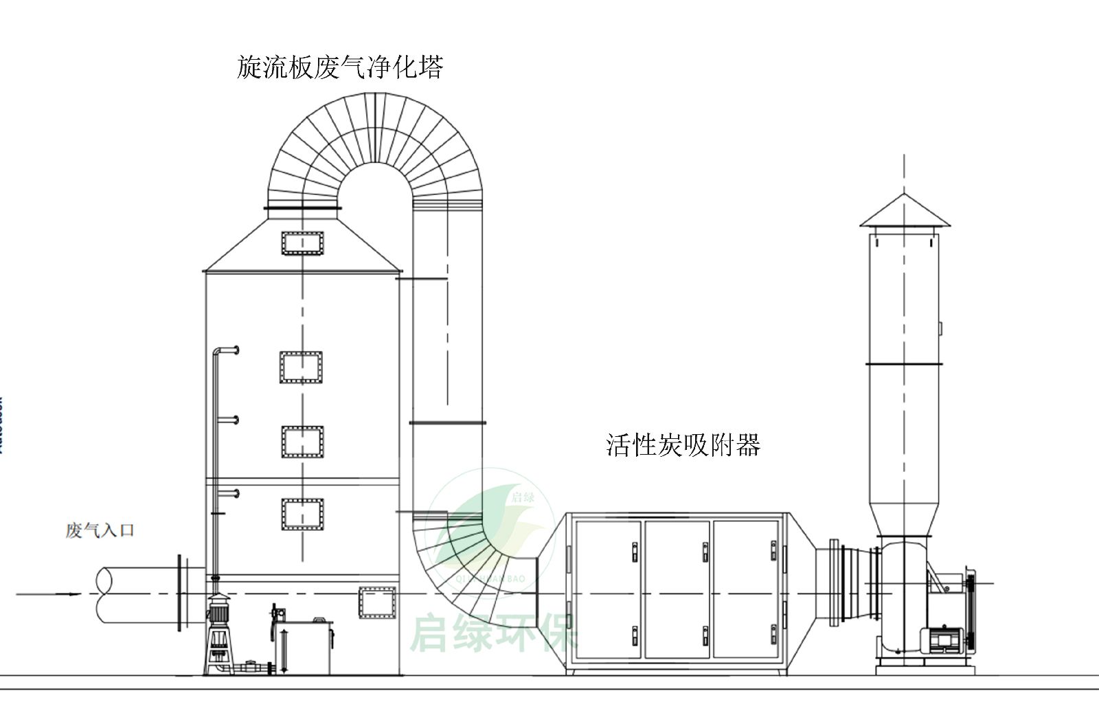 气源→高效吸收塔(吸收掉漆雾、粉尘以及颗粒物)→活性炭吸附塔(吸附部分苯甲苯二甲苯)→高压风机(高压的吸力作用下持续将废气抽出车间)→烟囱高空排放(也可低空排放)。